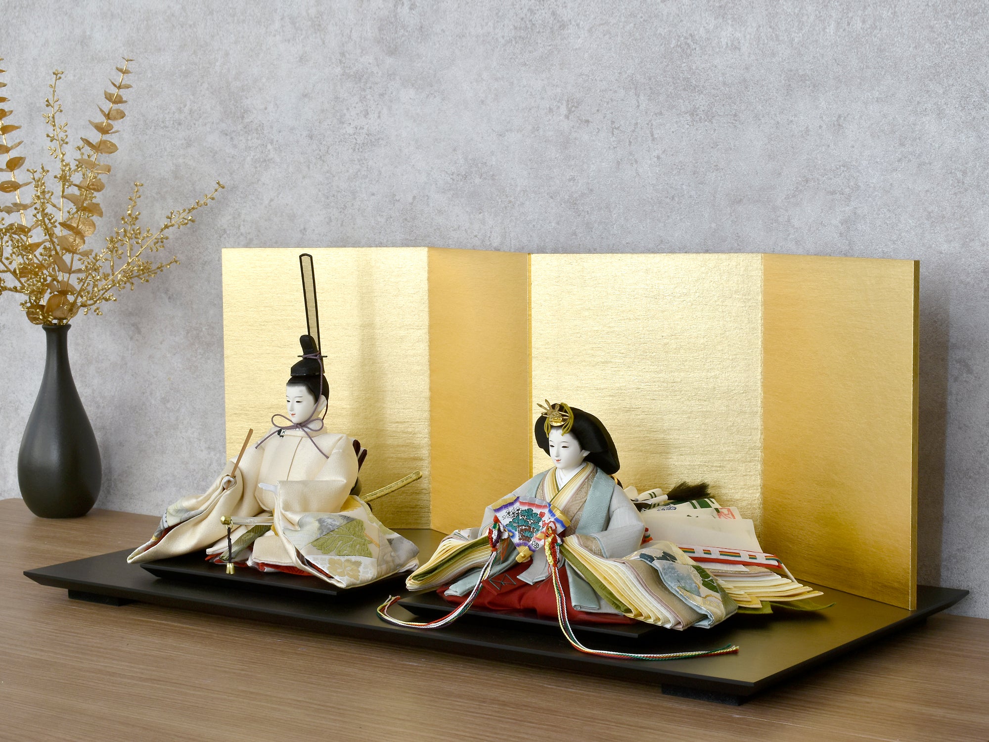 金屏風は節句飾りにおいて普遍的な定番商品。シンプルさゆえに作りの甘い人形は粗が目立つように見え、逆に丁寧につくられた人形はその美しさがより際立つという魔法のような屏風でもあります。