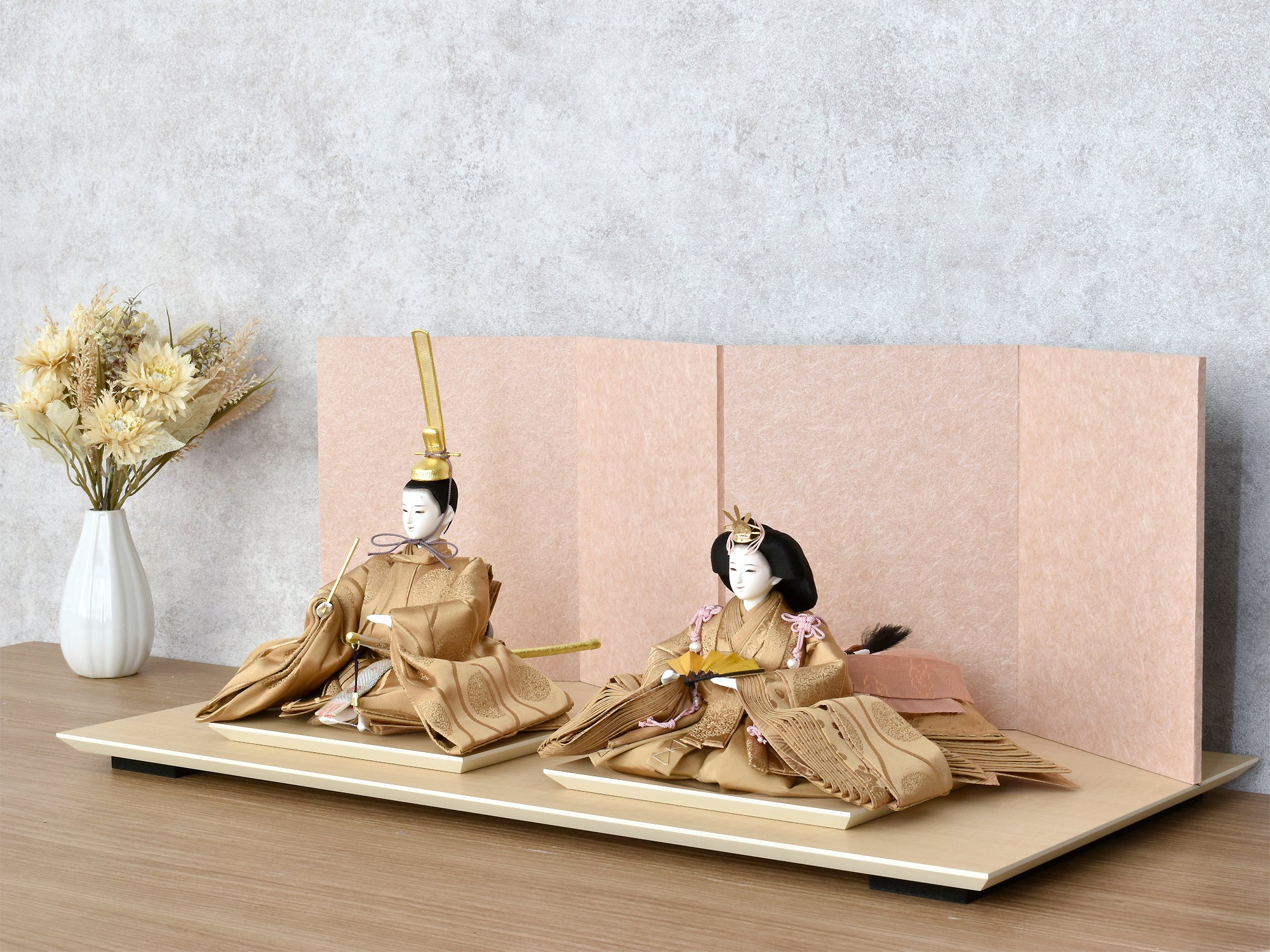 人形をより美しく、そして敬意をもって飾るために欠かせないのが周辺のお道具類。なかでも屏風や飾り台は単なる背景ではなく、主役を引き立て、空間全体に調和と格式をもたらす大切な存在です。