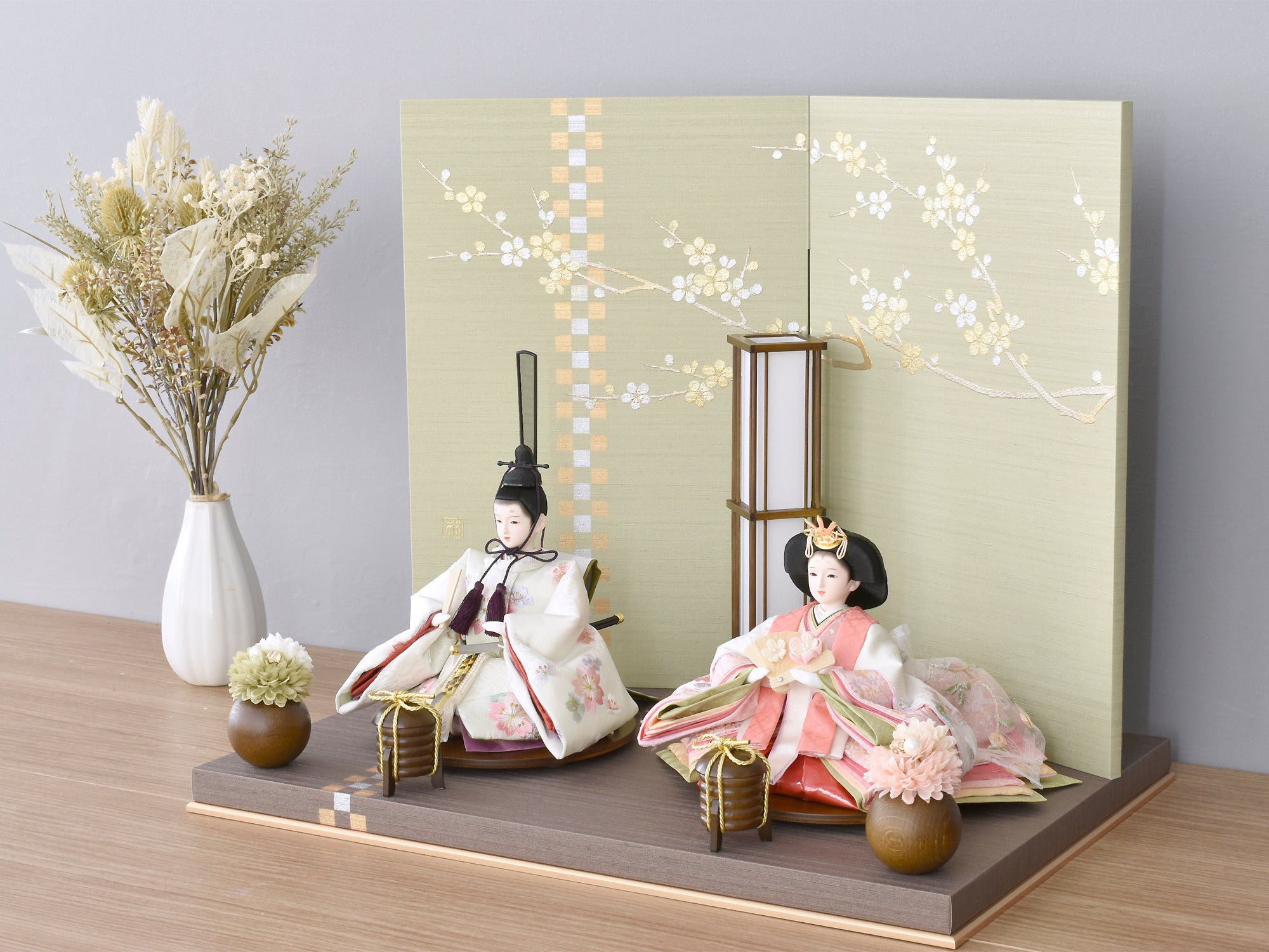 屏風に配した梅は金彩加工で立体的に仕上げています。屏風と飾り台に連なる市松格子柄がアクセントになっているほか、飾り台に傷がつきにくくなるよう布張りをほどこしている点に気遣いが感じ取れます。