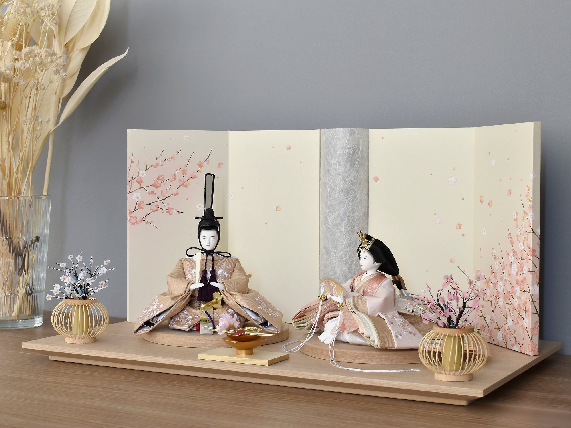 人形をより美しく際立たせるために存在する周辺のお道具類。なかでも屏風や飾台は、全体のイメージを左右するほど重要な役割を担っています。